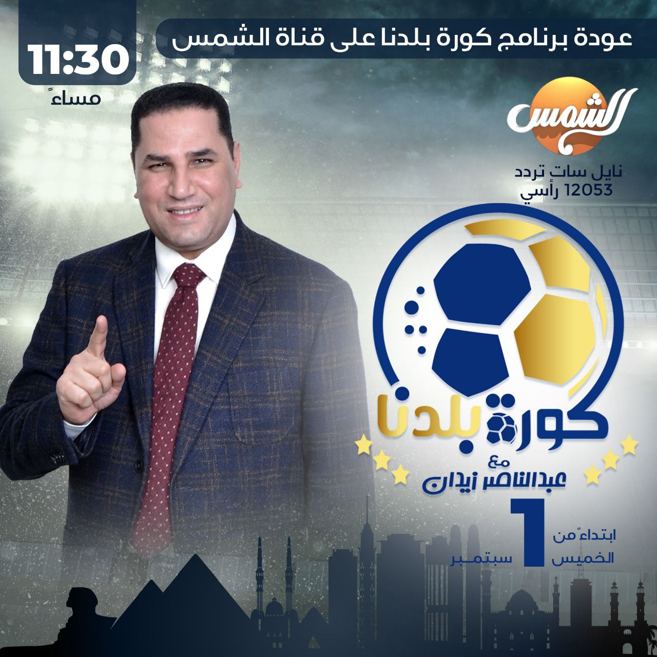 يعود الليلة للنور من جديد برنامج الكرة الشهير "كورة بلدنا" مع الإعلامي عبدالناصر زيدان علي شاشة قناة الشمس الفضائية “تردد 12053” .