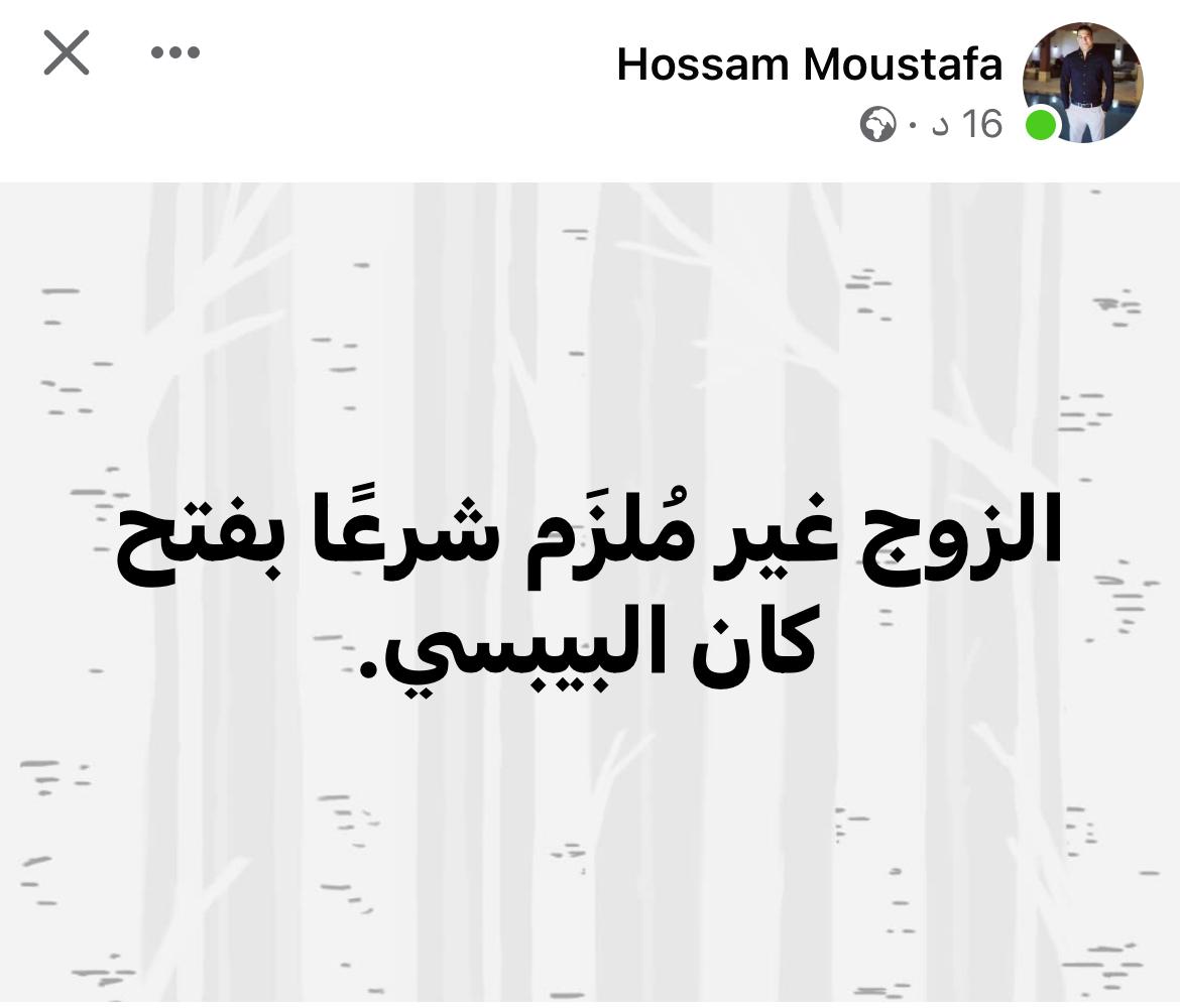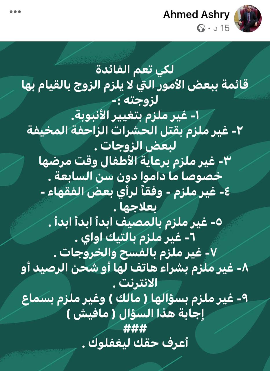 بينما سخر أحد رواد مواقع التواصل الأجتماعي، بأن الزوج غير مطالب شرعًا بتغيير أنبوبة البوتجاز حينما تفرغ، ولا قتل الحشرات التي تخشها السيدات في المنزل، ولا رعاية الأطفال وقت مرضها، خاصة الأطفال ما دون السابعة من العمر، بل ووفق بعض الفقهاء غير ملزم بعلاجها من الأساس
