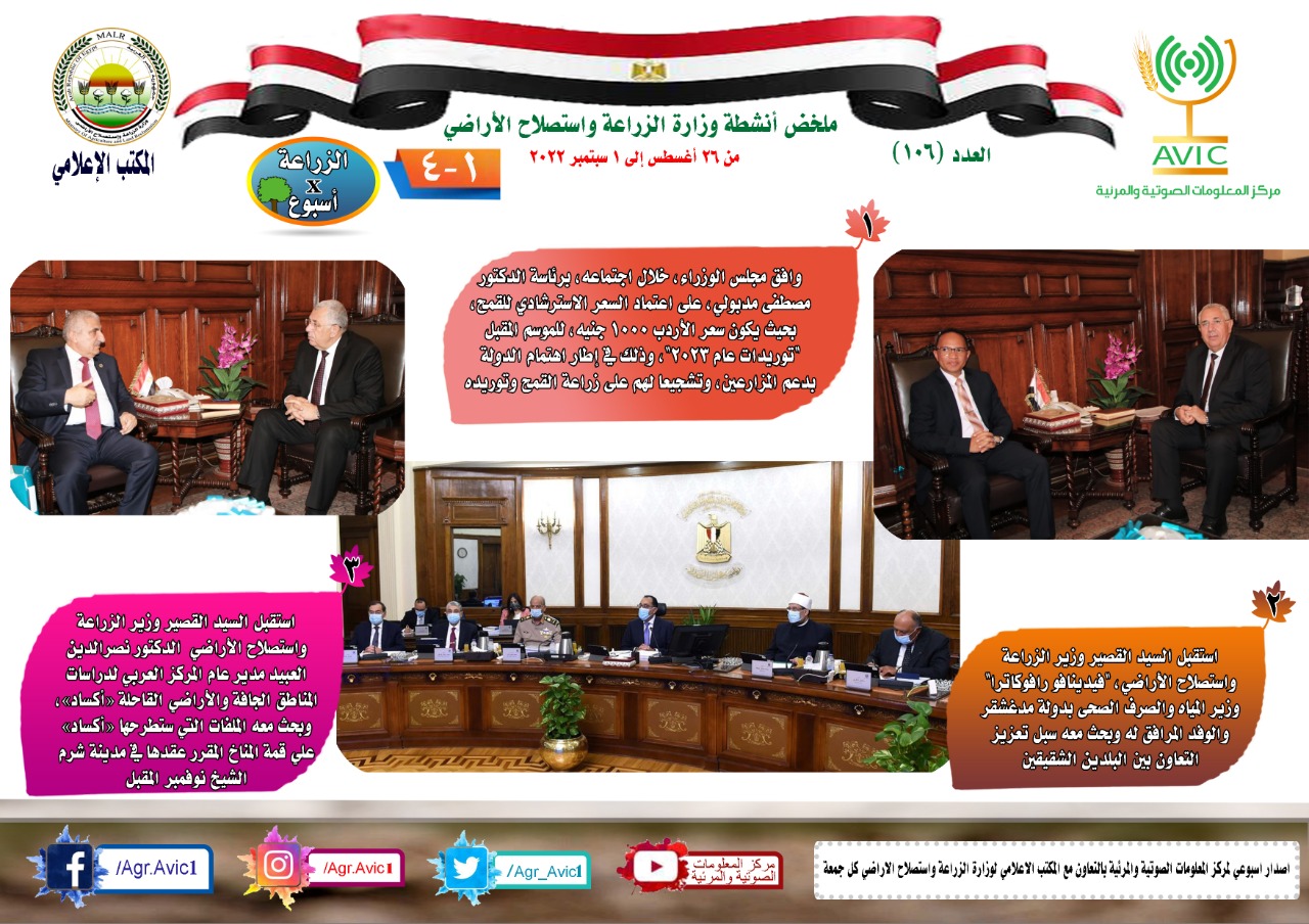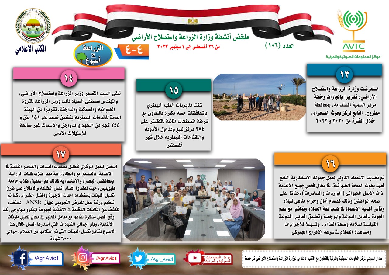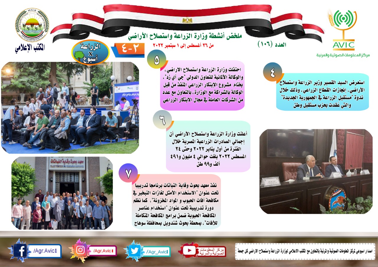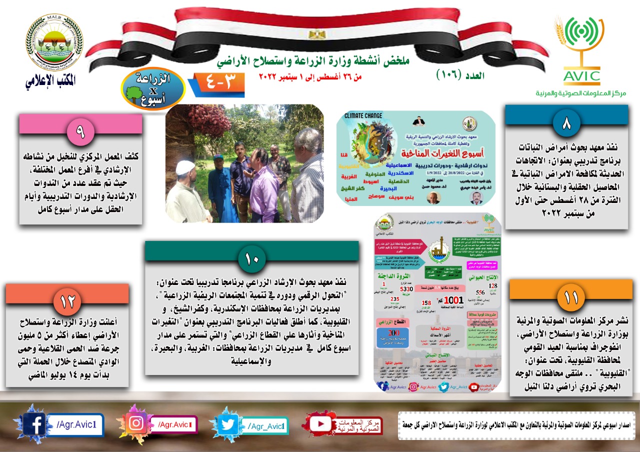 أصدر مركز المعلومات الصوتية والمرئية، التابع لوزارة الزراعة واستصلاح الاراضي، "الانفوجراف الاسبوعي" في نسخته رقم 106 ، حول الحصاد الاسبوعي لأهم أنشطة الوزارة، خلال الاسبوع الماضي في الفترة من 26 اغسطس وحتى 1 سبتمبر الجاري، وذلك بالتعاون مع المكتب الاعلامي للوزارة، كما أصدر المركز ايضا ملخصا بالفيديو، حول انشطة الوزارة خلال نفس الفترة.
