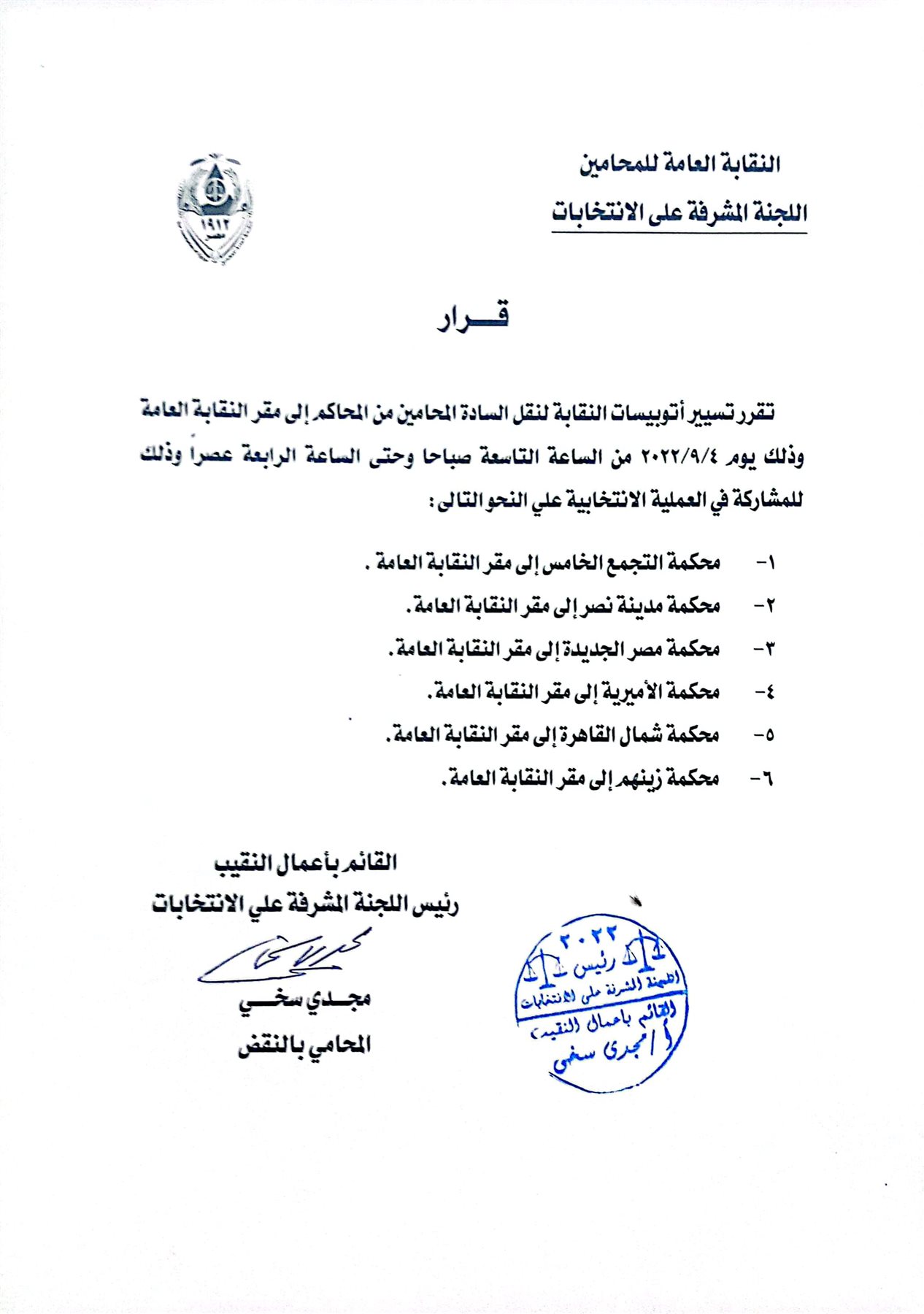 قررت اللجنة المشرفة على الانتخابات بالنقابة العامة للمحامين، تسيير أتوبيسات النقابة لنقل السادة المحامين من المحاكم إلى مقر النقابة العامة للمحامين، وذلك يوم 4 / 9 / 2022 من الساعة التاسعة صباحا، وحتى الرابعة عصرًا، وذلك للمشاركة في العملية الانتخابية على النحو الموضح في الصورة الضوئية المرفقة.