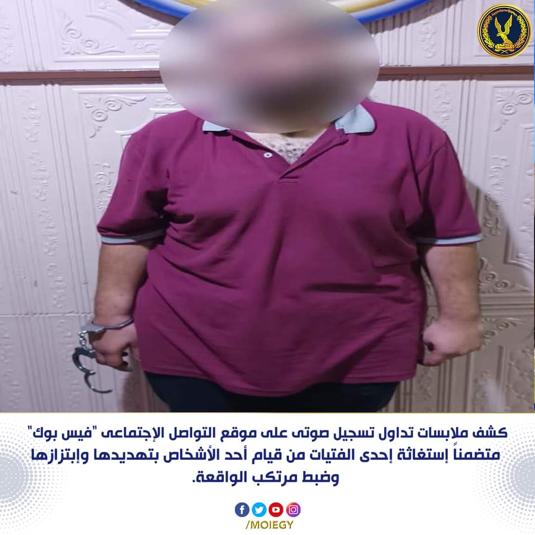 كشف ملابسات تسجيل صوتى متداول على إحد الصفحات الشخصية عبر مواقع التواصل الإجتماعى "فيس بوك" تضمن إستغاثة إحدى الفتيات مقيمة بدائرة قسم شرطة حدائق القبة بالقاهرة من قيام شخص بتهديدها وإبتزازها والتوعد بإلحاق الأذى بها.
