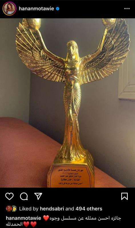 شاركت حنان مطاوع ،متابعيها صورة للجائزة وذلك عبر حسابها الشخصي علي "إنستجرام"، وعبرت مطاوع عن سعادتها البالغة بالحصول علي هذه الجائزة، وعلقت علي الصورة قائلة:" جائزه أحسن ممثلة عن مسلسل وجوه الحمدلله".