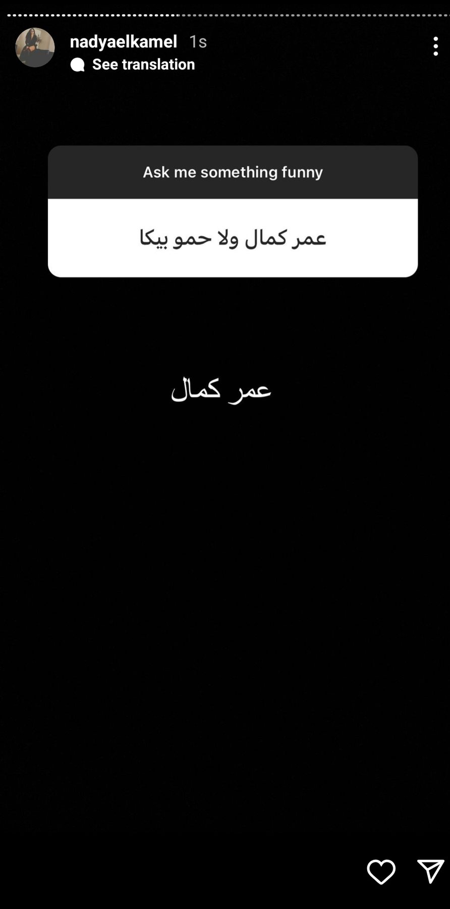 وردت ندى الكامل على صفحتها على موقع تبادل الصور والفيديوهات إنستجرام عبر خاصية الإستوري على سؤال المطرب المفضل بيت حمو بيكا و عمر كمال وقالت ندى عمر كمال.