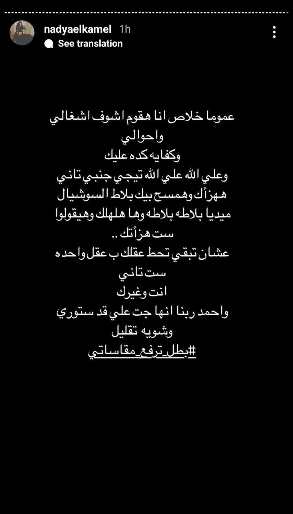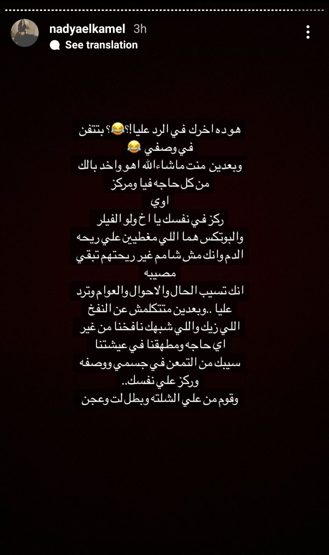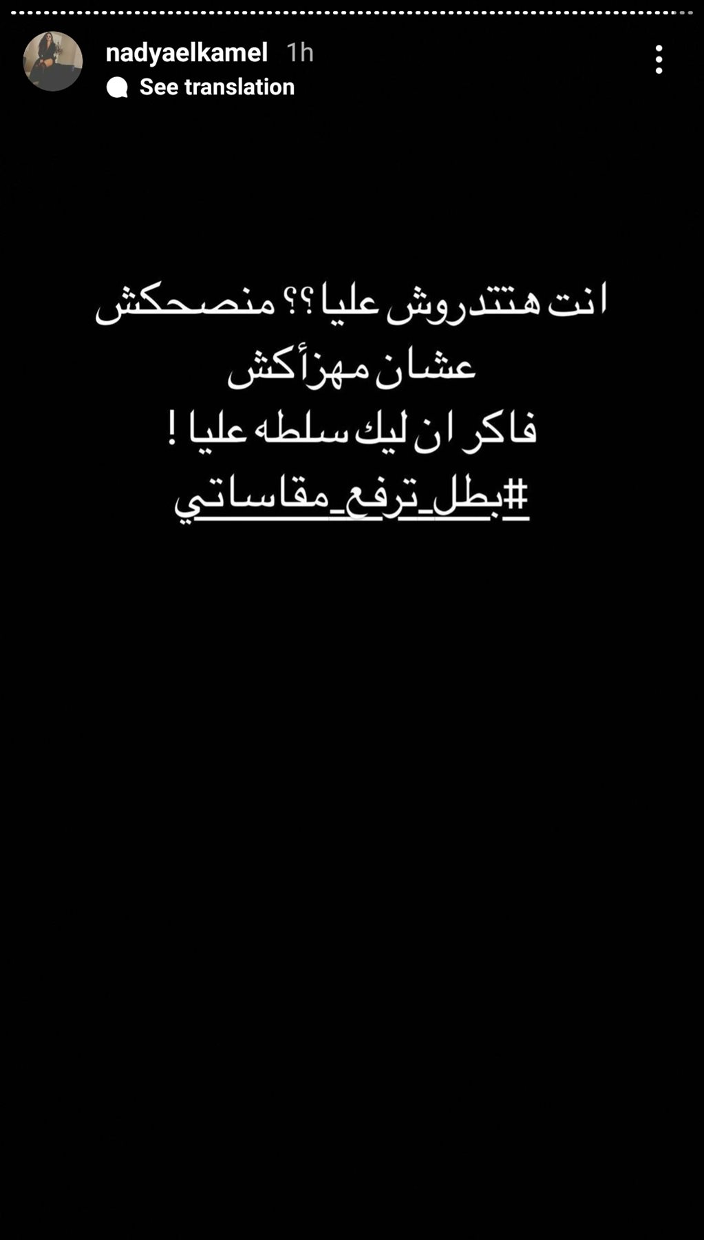 وتابعت ندى الكامل في استوري اخرى :" وبعدين انت بتهاجمني ولا بترفع مقاساتي ما تتوضي كده واستغفر ربنا وتصلي لك ركعتين بدل مانت عامل فيها خبير تجميل أو ترد عليا ب التي هي أحسن زي ما مفروض ترد بالحسنى وتحترم نفسك وشغلك".