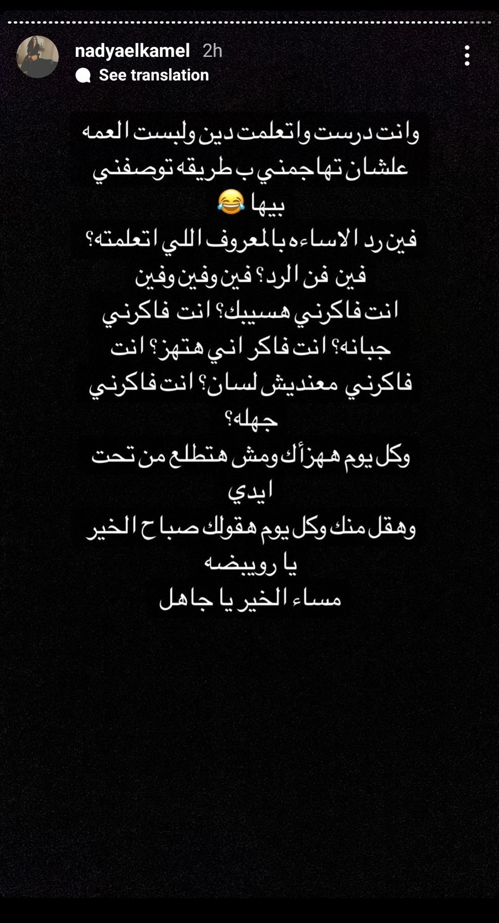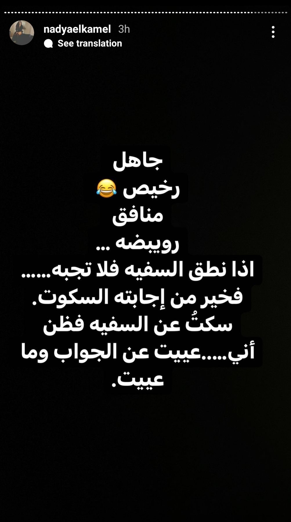 قالت ندى الكامل على موقع تبادل الصور والفيديوهات إنستجرام عبر خاصية الاستوري:" جاهل رخيص منافق رويبضه إذا نطق السفيه فلا تجبه فخير من إجابته السكوت سكت عن السفيه فظن أني عيب عن الجواب وما عييب".