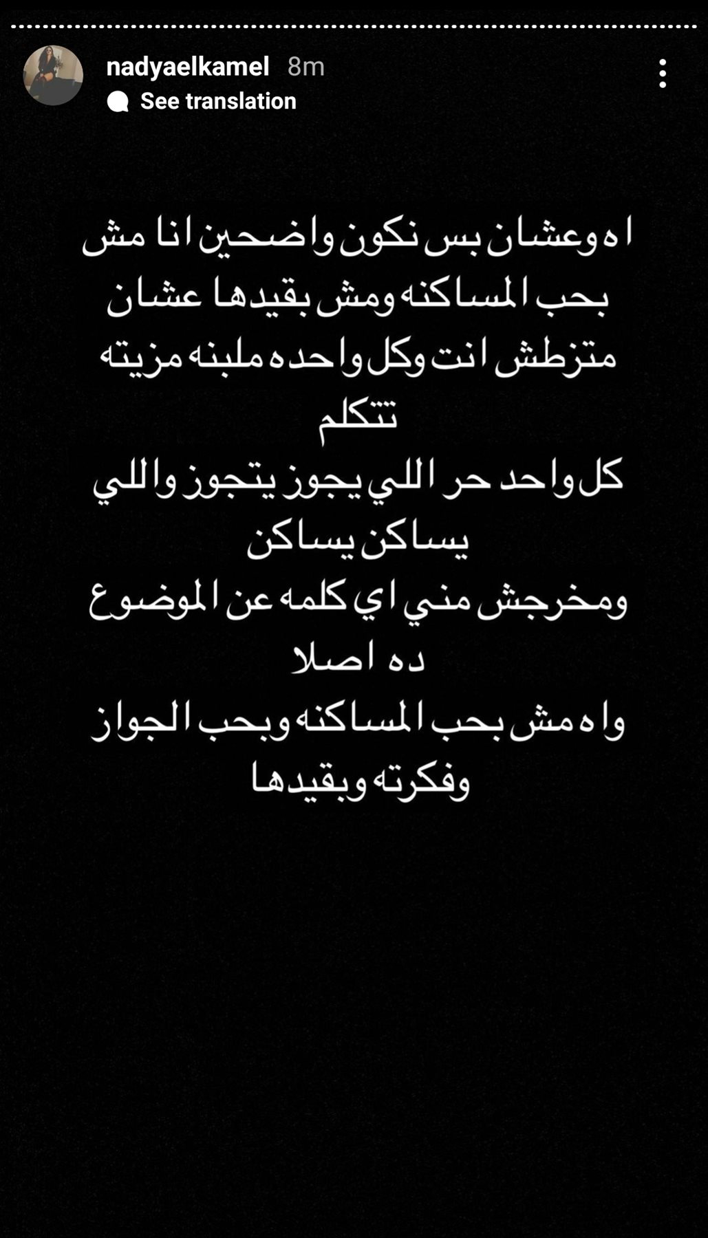 وعبرت ندى الكامل عن المساكنة قبل الزواج عبر صفحتها على موقع تبادل الصور والفيديوهات إنستجرام قائلة " انا مش بحب المساكنة ومش بقيدها.. كل واحد حر اللي يتجوز يتجوز واللي يساكن يساكن.. ومخرجش مني اي كلمة عن الموضوع ده اصلا ..ومش بحب المساكنة وبحب الجواز وفكرته وبقيدها".