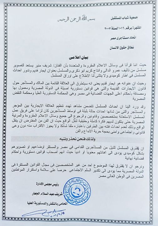 أصدر إتحاد مستأجري مصر بيان يحذر من النيل من المستأجرين القدامى في مصر والمستقر أوضعاهم أو تصويرهم بشكل كوميدي يؤدي إلى إهانتهم معنوياً أو أدبياً، وذلك خلال أحداث مسلسل "إيجار قديم" الذى يعمل عليه الفنان شريف منير، والذى يدور أحداثه في إطار كوميدي.