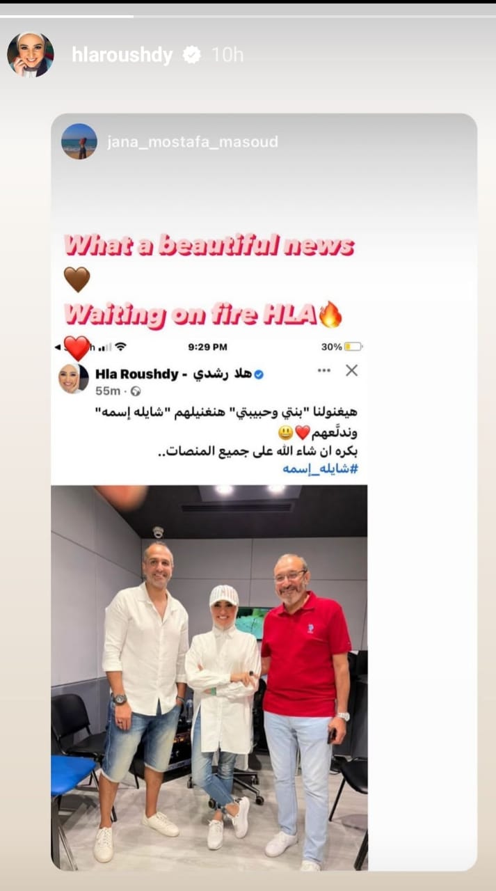 كتبت هلا رشدي عبر صفحتها على موقع تبادل الصور والفيديوهات “إنستجرام” قائلة:"هيغنولنا بنتي وحبيبتي هنغنيلهم شايلة إسمه وندلَّعهم، بكرة إن شاء الله على جميع المنصات".
