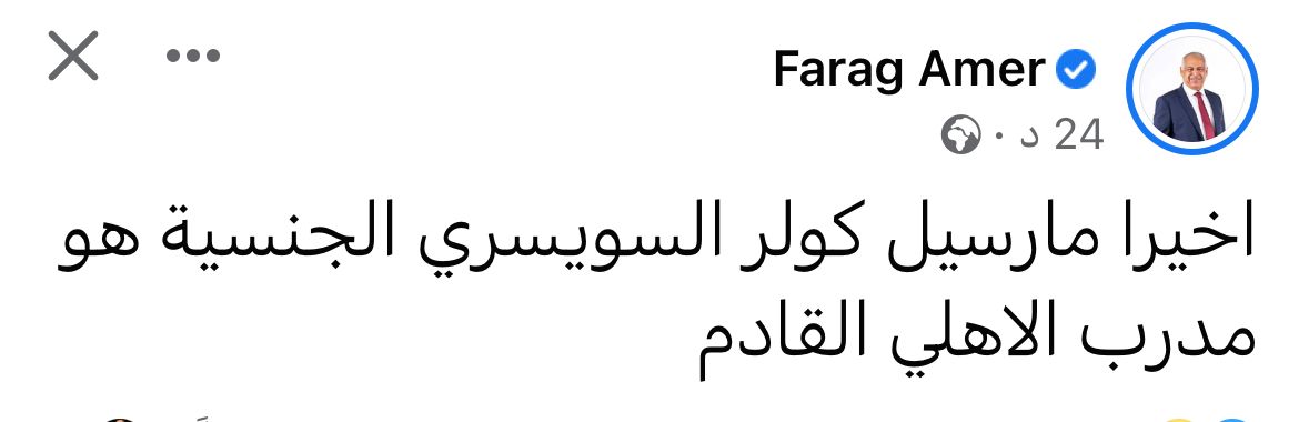 وكتب عامر عبر حسابه بموقع التواصل الإجتماعي “فيس بوك”، إخيرا مارسيل كولر السويسري الجنسية هو مدرب الأهلي القادم.