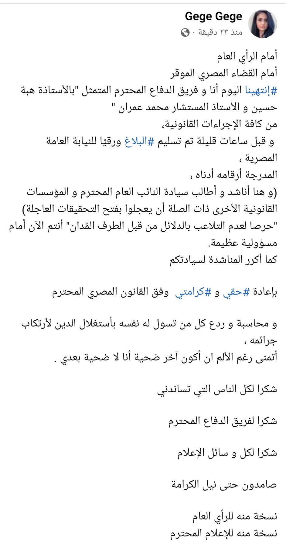 مناشدة النائب العام بإعادة حقها وكرامتي وفق القانون المصري المحترم، ومحاسبة وردع كل من تسول له نفسه بأستغلال الدين لأرتكاب جرائمه.