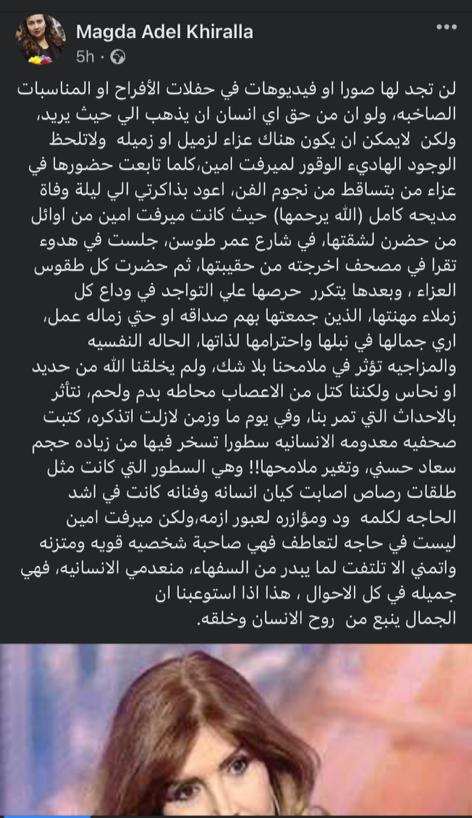 ونشرت ماجدة خير الله صورة لميرفت أمين علي صفحتها الشخصية علي "الفيس بوك"، وعلقت عليها قائلة:" لن تجد لها صورا او فيديوهات في حفلات الأفراح او المناسبات الصاخبه، ولو ان من حق اي انسان ان يذهب الي حيث يريد، ولكن لايمكن ان يكون هناك عزاء لزميل او زميله ولاتلحظ الوجود الهاديء الوقور لميرفت امين،كلما تابعت حضورها في عزاء من بتساقط من نجوم الفن، أعود بذاكرتي الي ليلة وفاة مديحه كامل (الله يرحمها) حيث كانت ميرفت امين من اوائل من حضرن لشقتها، في شارع عمر طوسن، جلست في هدوء تقرأ في مصحف اخرجته من حقيبتها، ثم حضرت كل طقوس العزاء".