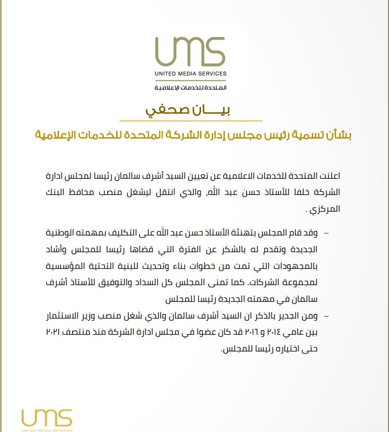 وجاء بيان المتحدة كالتالي: أعلنت المتحدة للخدمات الإعلامية عن تعيين أشرف سالمان رئيسا لمجلس إدارة الشركة خلفا للأستاذ حسن عبد الله، والذي انتقل ليشغل منصب محافظ البنك المركزي.