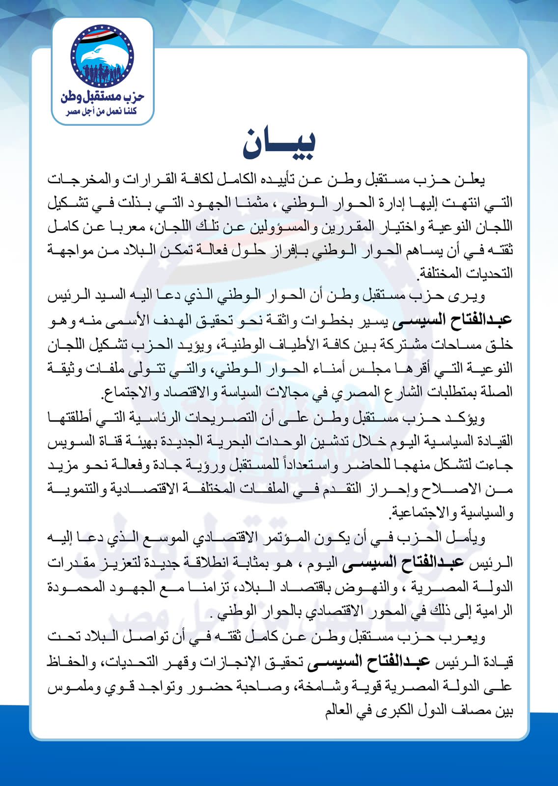 وأوضح الحزب أنه يري ان الحوار الوطني الذي دعا إليه الرئيس عبدالفتاح السيسي، يثير بخطوات واثقة نحو تحقيق الهدف الأسمى منه، وهو خلق مساحات مشتركة بين كافة الأطياف الوطنية، معلنًا تأييده لتشكيل اللجان النوعية التى أقرها مجلس أمناء الحوار الوطني.
