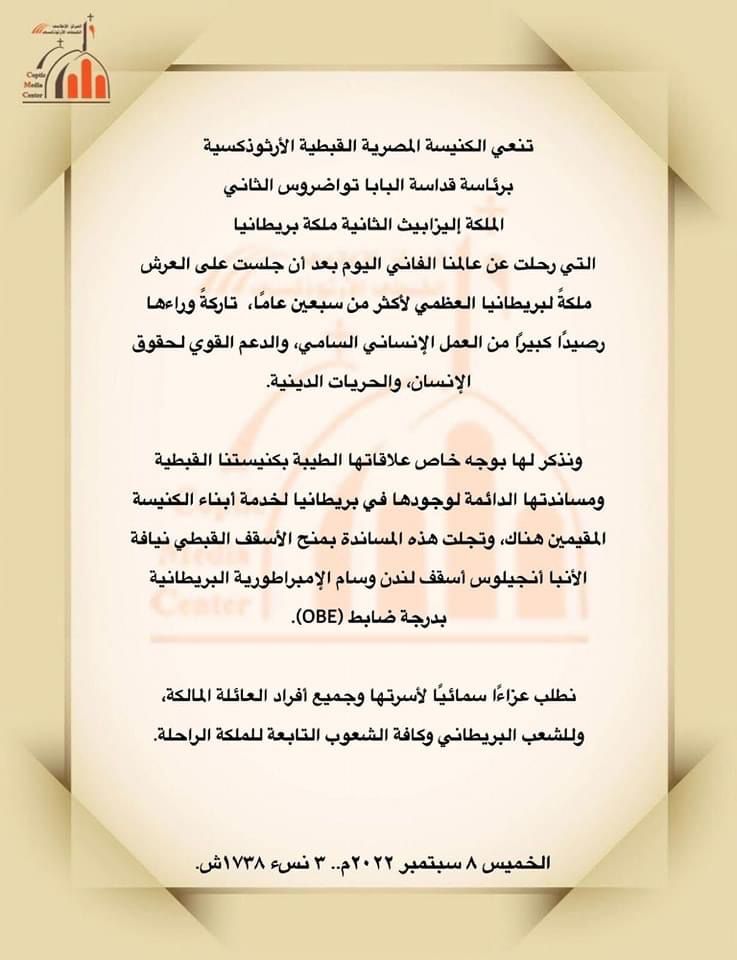 نعت الكنيسة المصرية القبطية الأرثوذكسية برئاسة البابا تواضروس الثاني في بيان لها منذ قليل، الملكة إليزابيث الثانية ملكة بريطانيا، والتي رحلت عن عالمنا اليوم بعد أنجلست على العرش ملكةً لبريطانيا العظمي لأكثر من سبعين عامًا، تاركةً وراءها رصيدًا كبيرًا من العمل الإنساني السامي، والدعم القوي لحقوق الإنسان،والحريات الدينية.