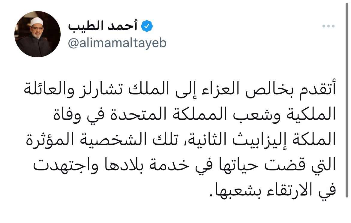 قدم الدكتور أحمد الطيب، شيخ الأزهر، العزاء إلى الملك تشارلز والعائلة الملكية وشعب المملكة المتحدة في وفاة الملكة إليزابيث الثانية، تلك الشخصية المؤثرة التي قضت حياتها في خدمة بلادها واجتهدت في الارتقاء بشعبها.
