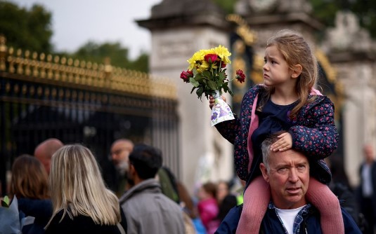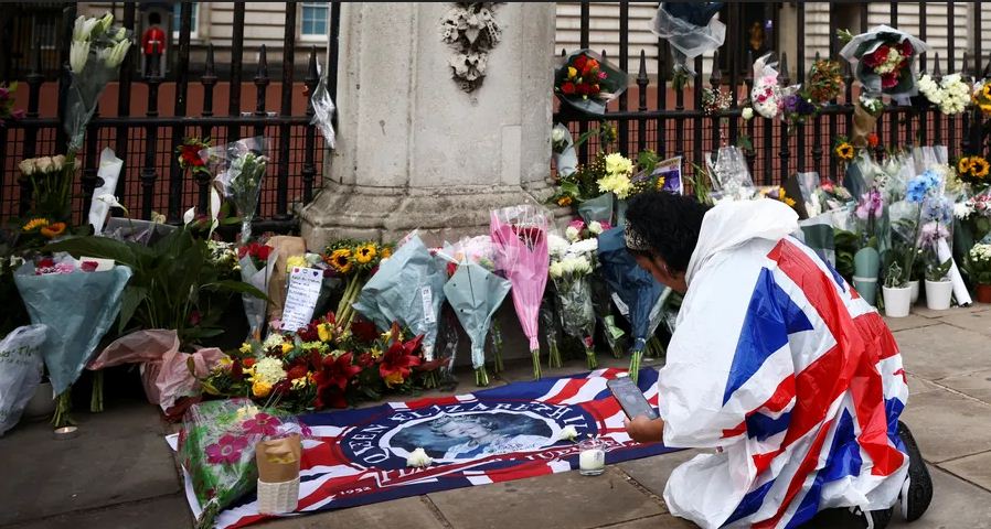 توافد عدد كبير من البريطانيين إلى قصر باكنجهام في العاصمة لندن، لوضع أكاليل الزهور والأعلام والرسائل التذكارية أمام القصر، تعبيرا عن حزنهم على وفاة الملكة إليزابيث الثانية.