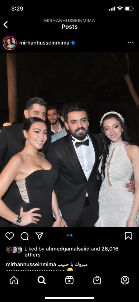 شاركت الفنانة مريهان حسين متابعيها صور لها من حفل زفاف إسلام جمال، وذلك عبر حسابها الخاص علي موقع تبادل الصور والفيديوهات "الإنستجرام"، صورة تجمعها بإسلام جمال وزوجته، وعلقت ميريهان قائلة:" مبروك يا حبيب عمتووو..إسلام جمال".