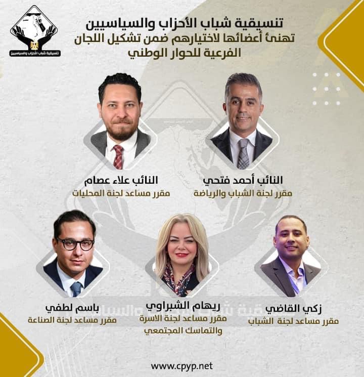 تعرب تنسيقية شباب الأحزاب والسياسيين عن شكرها واعتزازها لثقة مجلس أمناء الحوار الوطني في اختيار 5 من أعضائها ضمن اللجان الفرعية.
