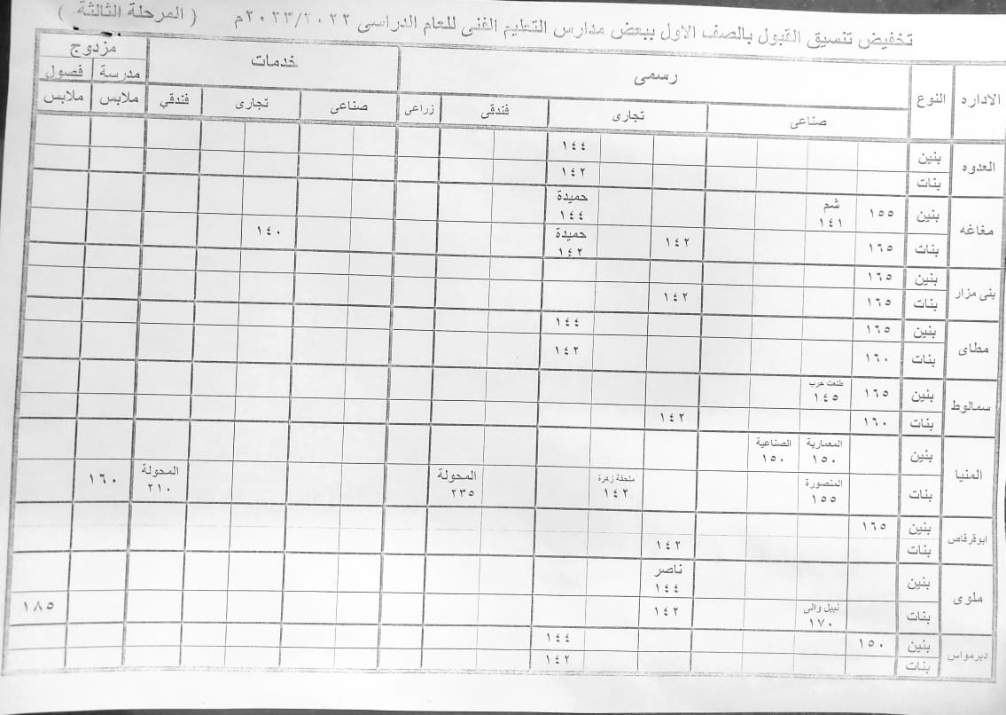 من جانبه، أوضح المهندس محمد الرشيدي وكيل وزارة التربية والتعليم بالمنيا، أن مجموع القبول بالثانوي العام أصبح 212 بتخفيض 3 درجات عن الحد الأدنى المعتمد وهو 215 وذلك في 34 مدرسة ثانوي، كما تم تخفيض مجموع القبول لعدد 2 مدرسة خاصة وهما ( المدرسة القومية الخاصة عربي لغات بالمنيا – مدارس سان مارك الخاصة بإدارة مغاغة) 15 درجة لتصبح 160 بدلا من 175، وتم تخفيض الحد الأدنى للقبول لفصول الخدمات للثانوي العام من 180 إلى 175 درجة في مدارس المحافظة بالإضافة لتخفيض مجموع القبول ببعض المدارس بالتعليم الفني طبقا للمقترحات المقدمة.
