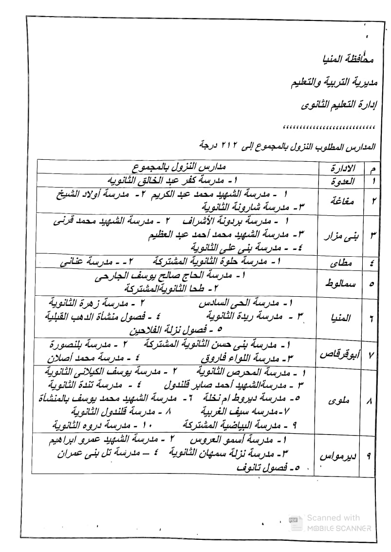- كان محافظ المنيا، قد وافق الشهر الماضي على خفض الحد الأدنى لدرجات القبول بالثانوي العام من 220 درجة إلى 215 درجة لشغل الأماكن الشاغرة بمدارس مدن وقرى المحافظة.