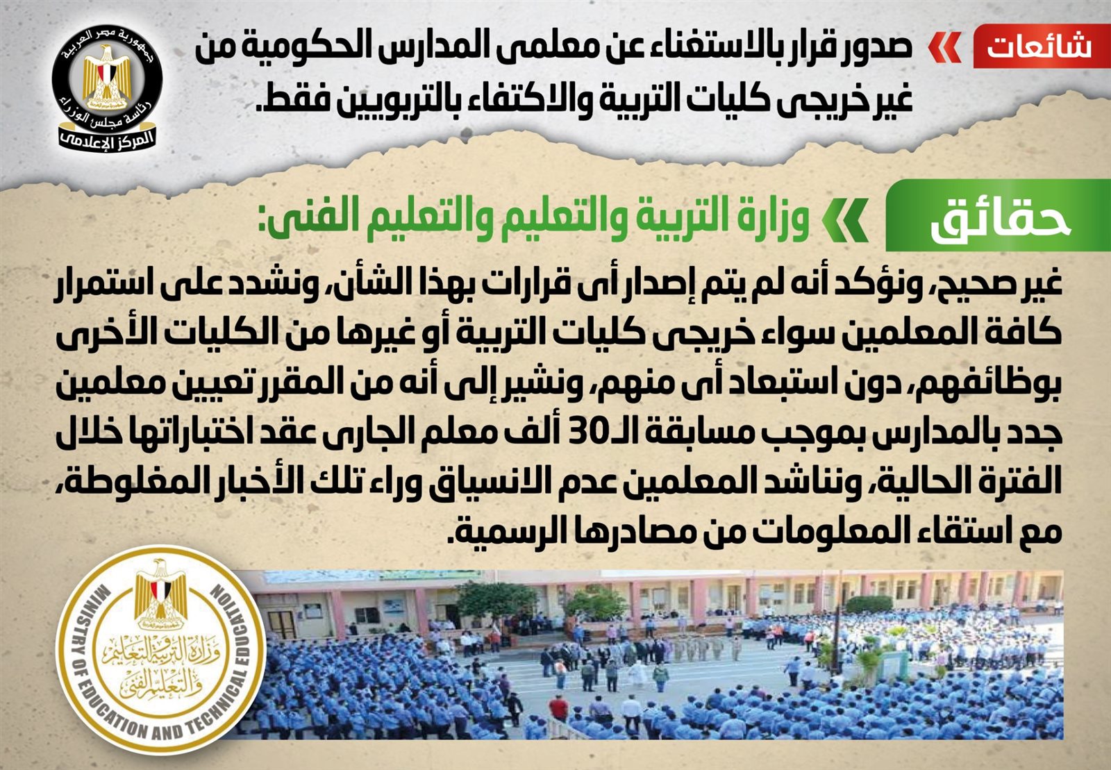 قام المركز الإعلامي لمجلس الوزراء بالتواصل مع وزارة التربية والتعليم والتعليم الفني، والتي نفت تلك الأنباء، مُؤكدةً أنه لا صحة للاستغناء عن أي من معلمي المدارس الحكومية من غير خريجي كليات التربية والاكتفاء بالتربويين فقط، وأنه لم يتم إصدار أي قرارات بهذا الشأن، مُشددةً على استمرار كافة المعلمين سواء خريجي كليات التربية أو غيرها من الكليات الأخرى بوظائفهم، دون استبعاد أي منهم، مُشيرةً إلى أنه من المقرر تعيين معلمين جدد بالمدارس بموجب مسابقة الـ 30 ألف معلم الجاري عقد اختباراتها خلال الفترة الحالية، مُناشدةً المعلمين عدم الانسياق وراء تلك الأخبار المغلوطة، مع استقاء المعلومات من مصادرها الرسمية.