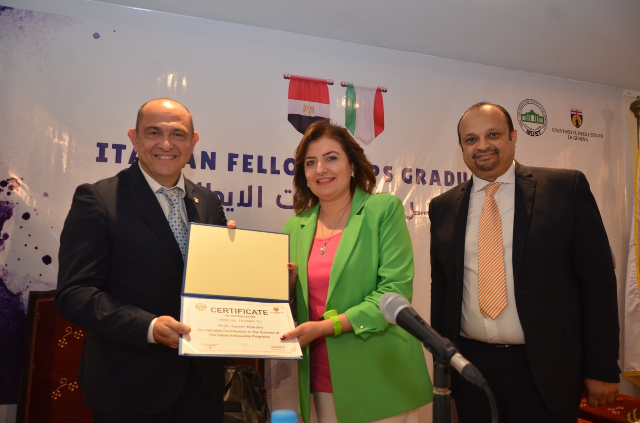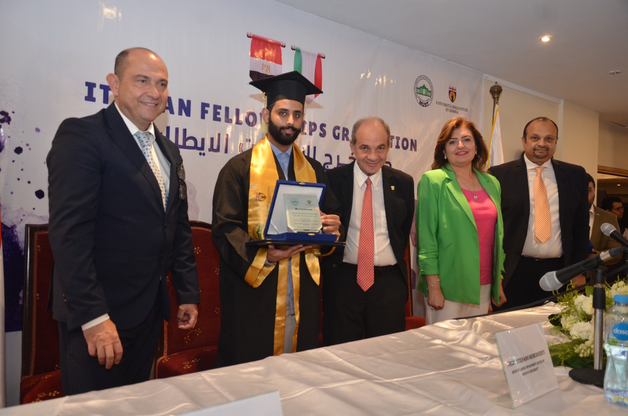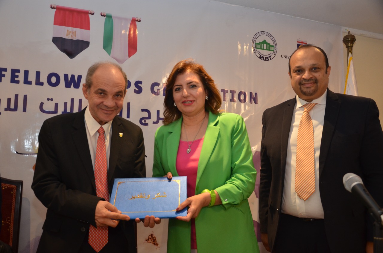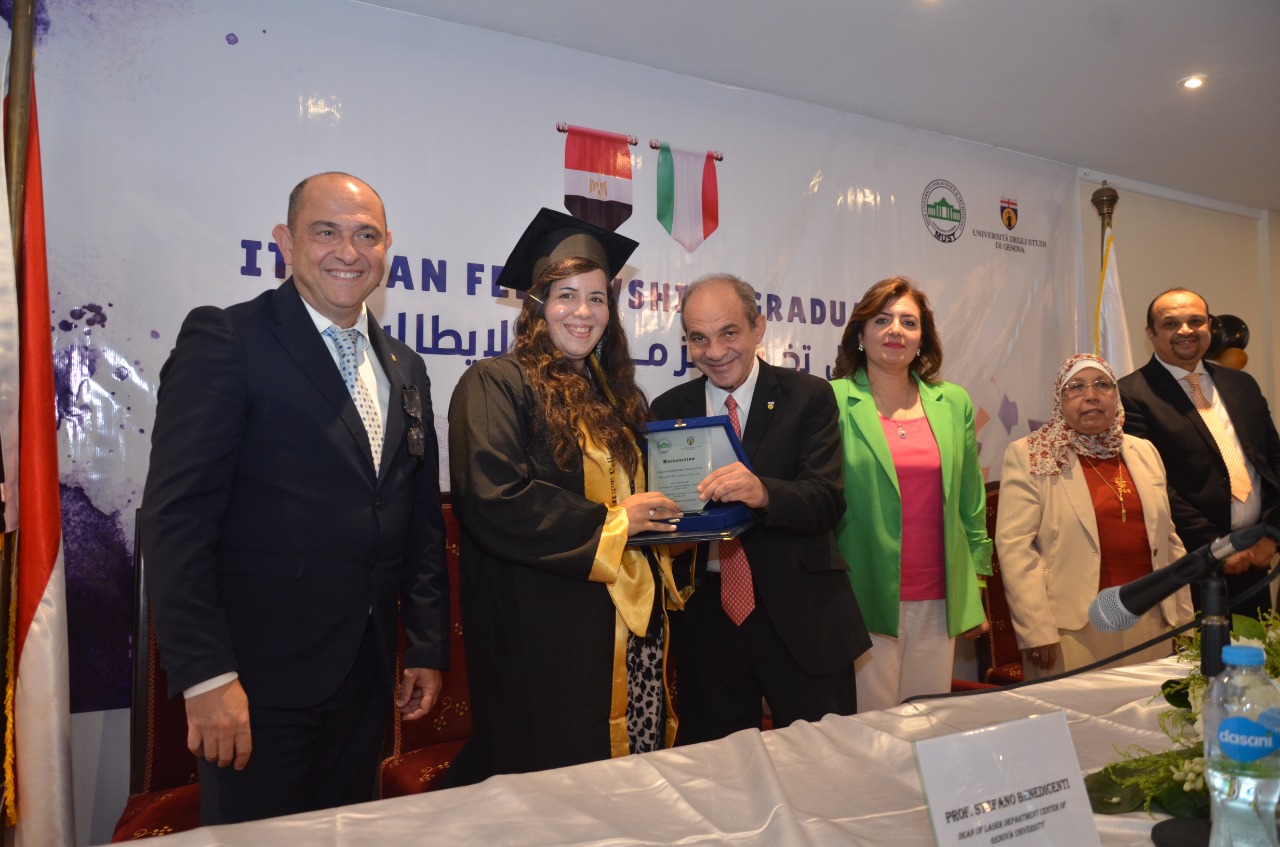 وعلى هامش الحفل قامت الدكتورة هالة المنوفي عميد كلية طب وجراحة الفم والأسنان بجامعة مصر للعلوم والتكنولوجيا، وستيفانو بندشينتي عميد مركز تطبيقات الليزر بجامعة جنوة الايطالية، والدكتورة جهاد حبلي منسق جامعة جنوة الايطالية في الشرق الأوسط وشمال افريقيا بتسليم شهادات ودروع التخرج.