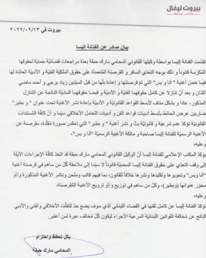أعلنت الفنانة إليسا مقاضاتها المطرب والملحن اللبناني زياد برجي نتيجة خلافها بعد تسريب أغنية "أنا وبس" بصوته وذلك بعد طرحها بصوتها ، حيث أوضح المكتب الإعلامى لها إنه ضمانا لحقوقها الأدبية والفنية ومقاضاة كل من سرب الأغنية بما فيها كاتب وملحن وناشر الأغنية.