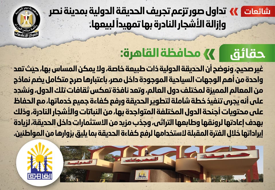 قام المركز الإعلامي لمجلس الوزراء بالتواصل مع محافظة القاهرة، والتي نفت تلك الأنباء، مُؤكدةً أنه لا صحة لتجريف الحديقة الدولية بمدينة نصر أو إزالة الأشجار النادرة بها تمهيداً لبيعها، مُوضحةً أن الحديقة الدولية ذات طبيعة خاصة، ولا يمكن المساس بها، حيث تعد واحدة من أهم الوجهات السياحية الموجودة داخل مصر، باعتبارها صرح متكامل يضم نماذج من المعالم المميزة لمختلف دول العالم، وتعد نافذة تعكس ثقافات تلك الدول، مُشددةً على أنه يجري تنفيذ خطة شاملة لتطوير الحديقة ورفع كفاءة جميع خدماتها، مع الحفاظ على محتويات أجنحة الدول المختلفة المتواجدة بها، من النباتات والأشجار النادرة، وذلك بهدف إعادتها لرونقها وطابعها التراثي، وجذب مزيد من الاستثمارات داخل الحديقة، لزيادة إيراداتها خلال الفترة المقبلة لاستخدامها لرفع كفاءة الحديقة بما يليق بزوارها من المواطنين.