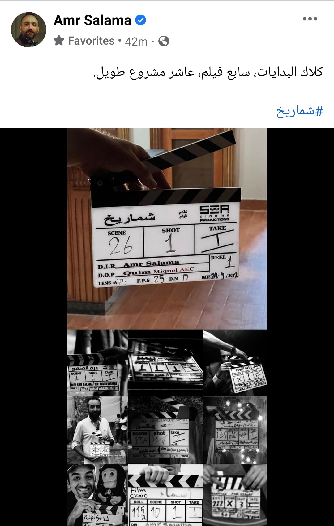ونشر على صفحته الرسمية على موقع التواصل الاجتماعي فيسبوك علق قائلا:"كلاك البدايات، سابع فيلم، عاشر مشروع طويل..شماريخ"