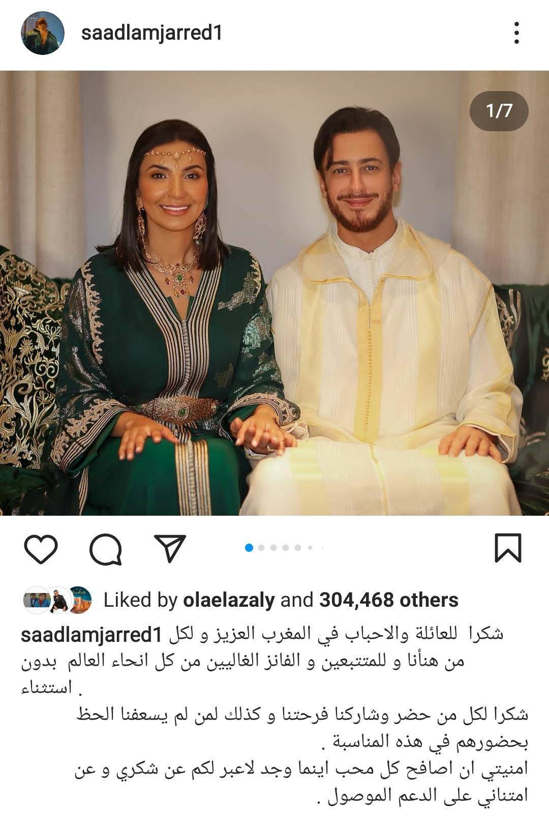 قائلا:"شكرًا للعائلة والأحباب في المغرب العزيز ولكل من هنأنا وللمتتبعين والفانز الغاليين من كل أنحاء العالم بدون استثناء، شكرا لكل من حضر وشاركنا فرحتنا وكذلك لمن لم يسعفنا الحظ بحضورهم في هذه المناسبة".
