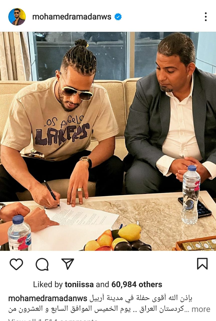 كتب محمد رمضان، على صفحته عبر موقع تبادل الصور والفيديوهات إنستجرام قائلا:"بإذن الله أقوى حفلة في مدينة أربيل كردستان العراق، يوم الخميس الموافق السابع والعشرين من أكتوبر بعد حفلة إسكندرية بعشرين يوم".