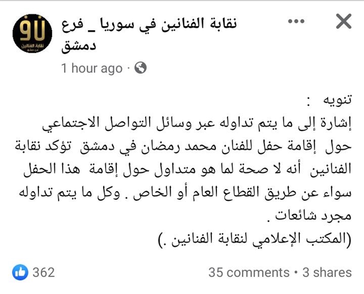 وقال نقابة الفنانين السوريين في نص بيانها:" إشارة إلى ما يتم تداوله عبر وسائل التواصل الاجتماعي حول إقامة حفل للفنان محمد رمضان في دمشق؛ تؤكد نقابة الفنانين أنه لا صحة لما هو متداول حول إقامة هذا الحفل، سواء عن طريق القطاع العام أو الخاص، وكل ما يتم تداوله مجرد شائعات".