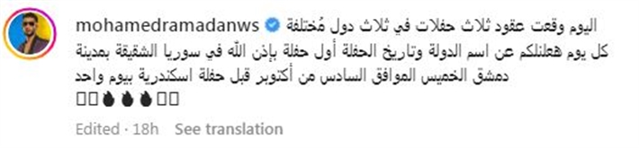 وكان الفنان محمد رمضان قد كتب عبر حسابه الرسمي: " اليوم وقعت عقود ثلاث حفلات في ثلاث دول مختلفة، كل يوم هعلنلكم عن اسم الدولة وتاريخ الحفلة أول حفلة بإذن الله في سوريا الشقيقة بمدينة دمشق الخميس الموافق السادس من أكتوبر قبل حفلة اسكندرية بيوم واحد".