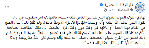 أكدت دار الإفتاء، أن تهادي حلوى المولد النبوي الشريف بين الناس سُنة حسنة، فالتهادي أمر مطلوب في ذاته؛ لقول النبي صلى الله عليه وآله وسلم: «تَهَادوْا تَحَابوْا» (موطأ مالك).