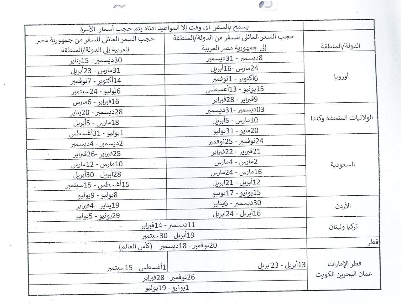 وفي السياق ذاته، أوضحت وزارة الطيران أن العروض ستكون متاحة على موقع "مصر للطيران" ووكلاء السياحة في أنحاء العالم كافة، ولن تكون متاحة على الموقع الإلكتروني للشركة، حيث إن فترة تطبيق العروض جاهزة للحجز الفوري على الرحلات بداية من أول أكتوبر المقبل وحتى نهاية سبتمبر من العام القادم 2023، فيما عدا الأوقات التالية المرفقة بجدول حيث تتوقف فيها العروض نظرًا لكثافة الحجز المسبق بالفعل على تلك الرحلات.