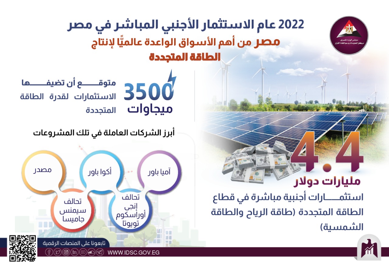 - كما تعد مصر من أهم الأسواق الجاذبة للاستثمار في مجال الطاقة المتجددة حيث وصلت إلى 4.4 مليارات دولار (طاقة الرياح والطاقة الشمسية) ضمن الاستراتيجية الوطنية للاعتماد على الطاقة النظيفة، وكان من أبرز تلك الشركات أكوا باور، تحالف سيمنس – جاميسا ومصدر وآميا باور وغيرها من الشركات الأخرى.