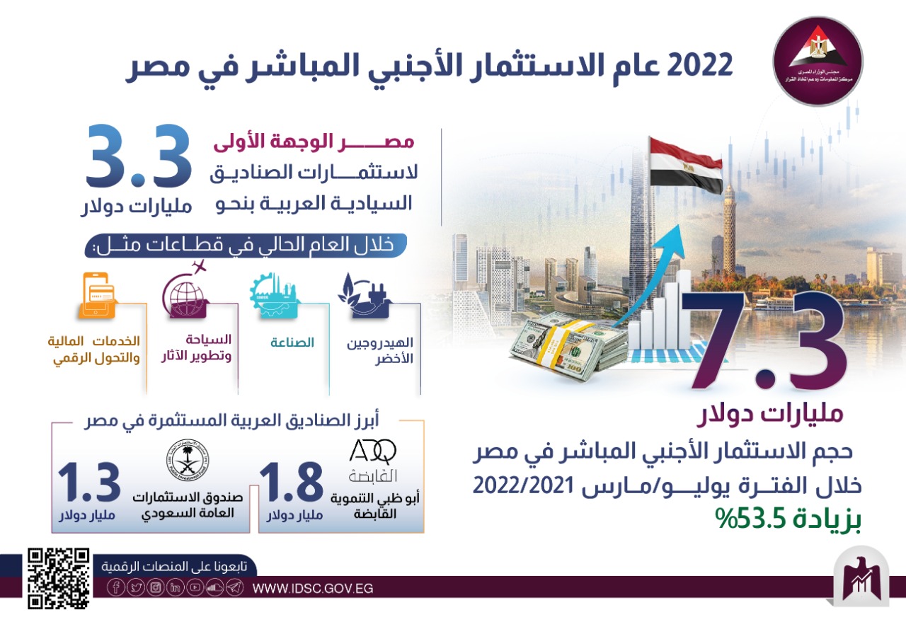 نشر مركز المعلومات ودعم اتخاذ القرار إنفوجرافيك جديدًا يتناول تحول مصر لأهم الوجهات الاستثمارية في المنطقة خلال الفترة الأخيرة؛ حيث وصل حجم الاستثمارت الأجنبية المباشرة في مصر خلال الفترة يوليو/مارس 2021/2022 إلى 7.3 مليارات دولار بزيادة 53.5%، كما تعد مصر الوجهة الاستثمارية الأولى للصناديق السيادية العربية، في مقدمتها الاستثمارات السعودية، والاستثمارات الإماراتية، ضمن الاستثمارات الخليجية في مصر بوجه عام، ووصلت مساهمة الاستثمار الأجنبي المباشر في مصر، خلال العام الحالي إلى 3.3 مليارات دولار موزعة على القطاعات المختلفة مثل الهيدروجين الأخضر، والأمونيا الخضراء والسياحة والصناعة والخدمات المالية والتحول الرقمي.