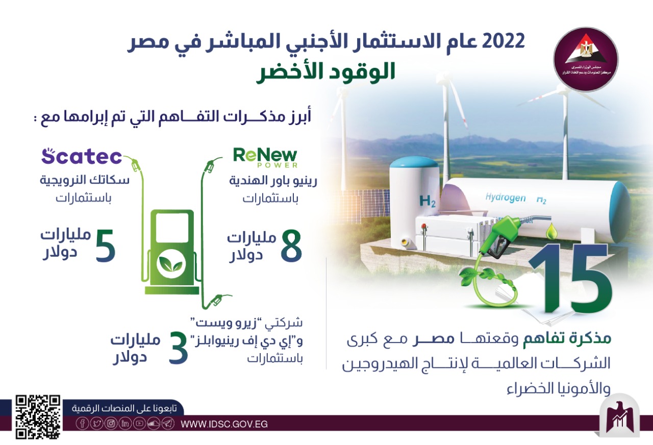 - كما تشق مصر طريقها للتحول لمركز إقليمي لتجارة الطاقة الخضراء بالتعاون مع كبرى الشركات العالمية؛ حيث قامت بتوقيع 15 مذكرة تفاهم مع كبرى الشركات العالمية لإنتاج الهيدروجين والأمونيا الخضراء، أبرز تلك المشروعات: مذكرة تفاهم مع رينيو باور الهندية باستثمارات 8 مليارات دولار ومذكرة تفاهم مع سكاتك النرويجية باستثمارات 5 مليارات دولار ومذكرة تفاهم مع شركتي “زيرو ويست” و”إي دي إف رينيوابلز" باستثمارات 3 مليارات دولار.