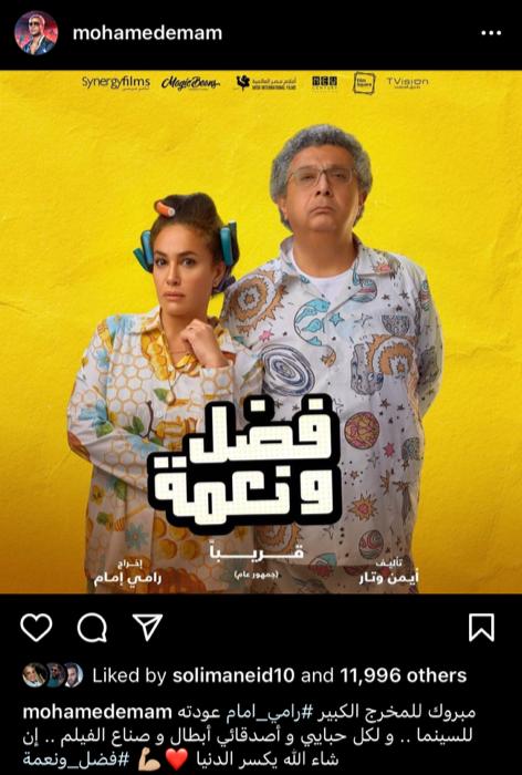حرص الفنان محمد إمام علي تهنئة شقيقه المخرج رامي إمام بعد عودته للسينما بفيلم "فضل ونعمة"بطولة الفنانة هند صبري والفنان ماجد الكدواني.
