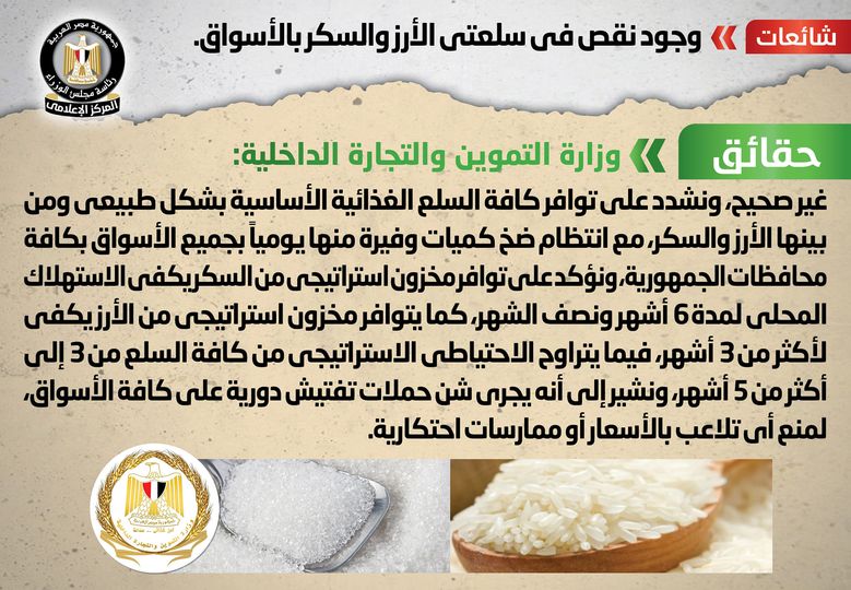 قام المركز الإعلامي لمجلس الوزراء بالتواصل مع وزارة التموين والتجارة الداخلية، والتي نفت تلك الأنباء، مُؤكدةً أنه لا صحة لوجود نقص في سلعتي الأرز والسكر بالأسواق، مُشددةً على توافر كافة السلع الغذائية الأساسية بشكل طبيعي ومن بينها الأرز والسكر، مع انتظام ضخ كميات وفيرة منها يومياً بجميع الأسواق بكافة محافظات الجمهورية، مشيرةً إلى توافر مخزون استراتيجي من السكر يكفي الاستهلاك المحلي لمدة 6 أشهر ونصف الشهر، كما يتوافر مخزون استراتيجي من الأرز يكفي لأكثر من 3 أشهر، فيما يتراوح الاحتياطي الاستراتيجي من كافة السلع من 3 إلى أكثر من 5 أشهر، مُشيرةً إلى أنه يجري شن حملات تفتيش دورية على كافة الأسواق، لمنع أي تلاعب بالأسعار أو ممارسات احتكارية.