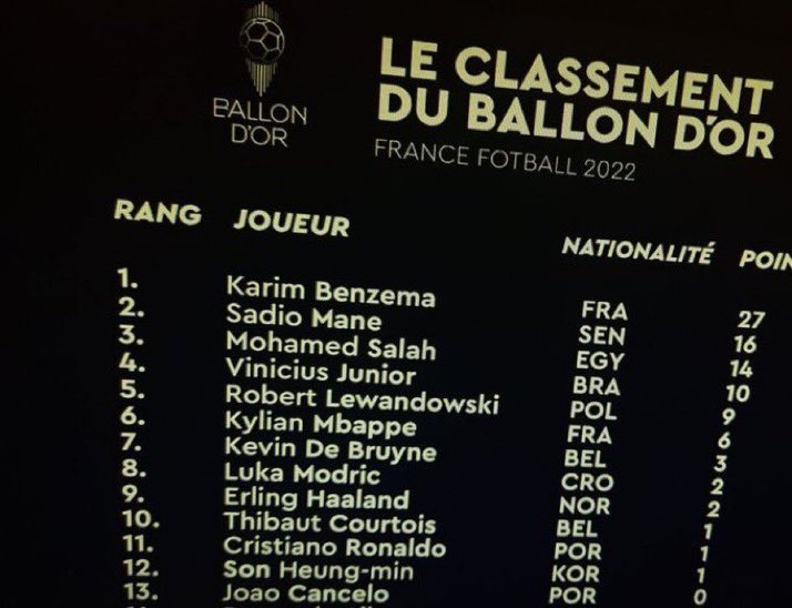 وكشفت الصورة المسربة أن كريم بنزيما مهاجم منتخب فرنسا ونادي ريال مدريد الإسباني هو الفائز بجائزة "الكرة الذهبية" بعدما قاد ريال مدريد للفوز ببطولة دوري أبطال أوروبا بجانب الدوري الإسباني "الليجا" وكأس السوبر الأوروبي حيث حصد 27 نقطة في سباق التصويت.