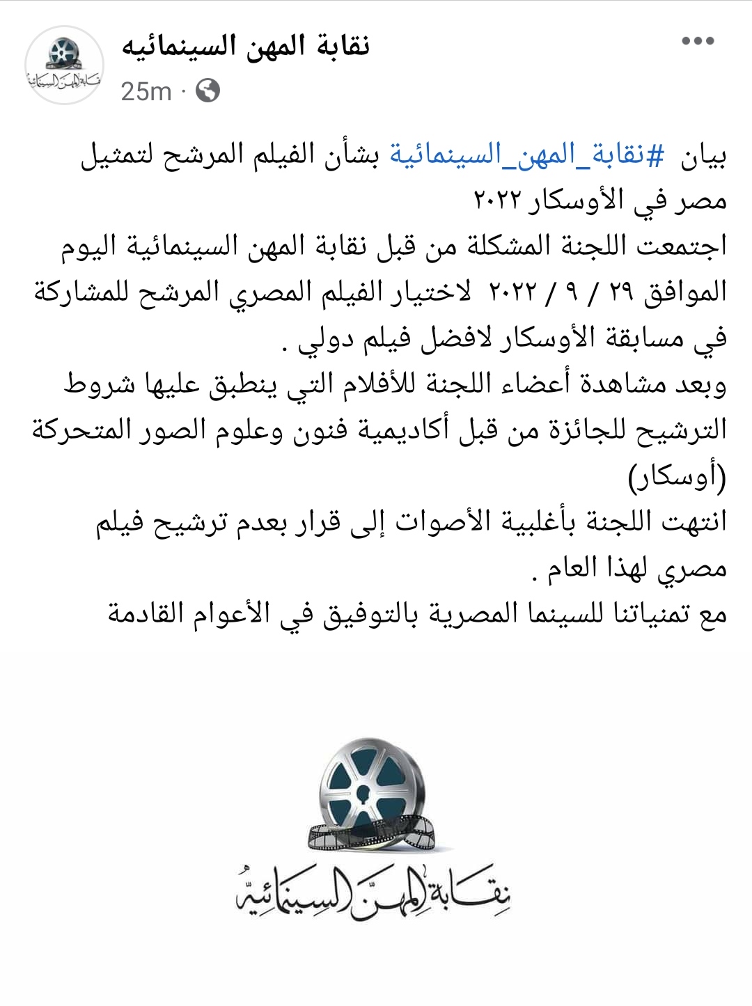 نقابة المهن السينمائية تقرر عدم ترشيح فيلم مصري للمشاركة في أوسكار هذا العام