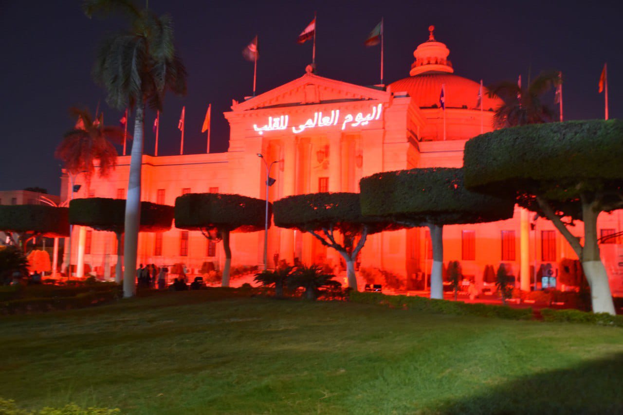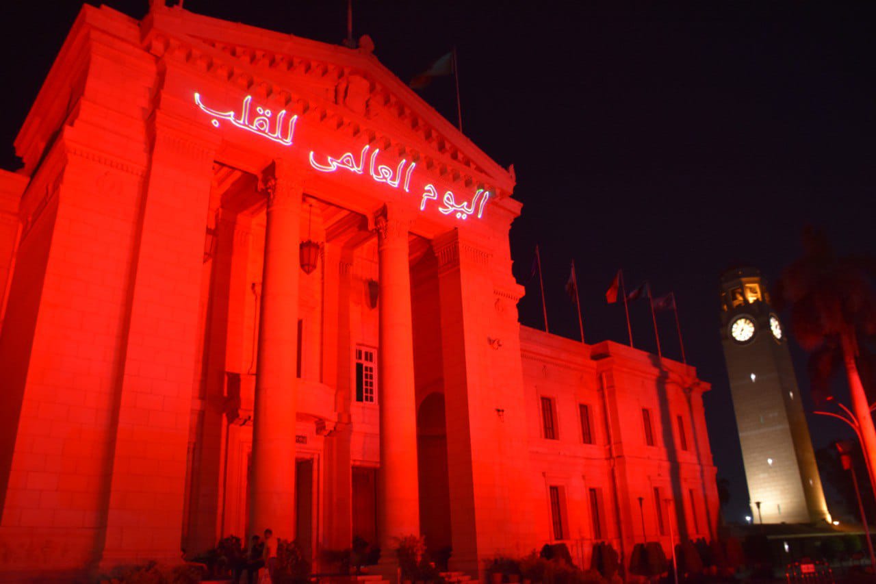 إضاءة قبة جامعة القاهرة باللون الأحمر احتفالًا باليوم العالمي للقلب