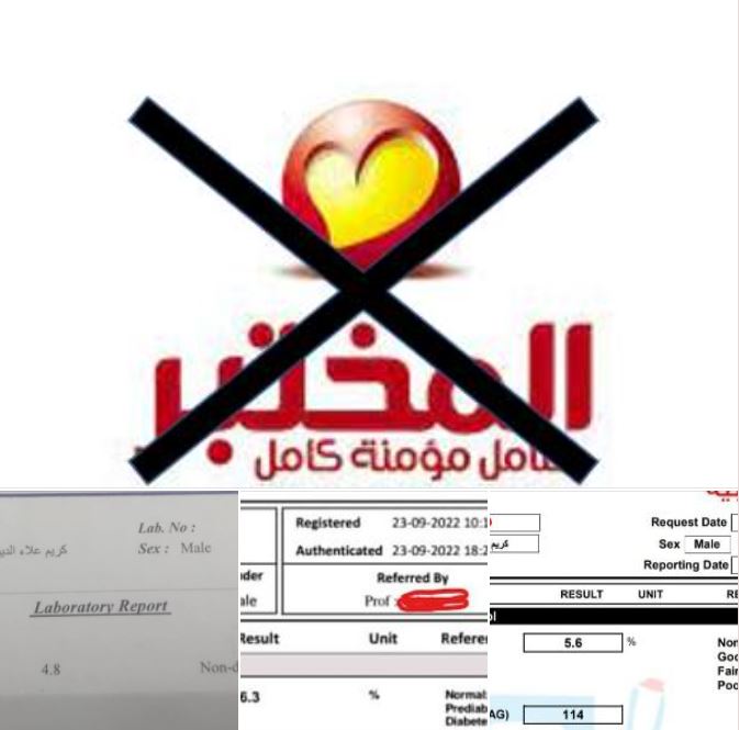 تداول رواد مواقع التواصل الاجتماعى صورة لتحذير أحد المواطنين من معمل المختبر وإنه يظهر النتائج بشكل خطأ ولا يعترفون بهذا الخطأ مما قد يؤثر على طريقة علاج الشخص والأدوية التى يتناولها ظناً منه أن نتيجة تحليله صحيحة.