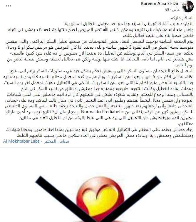 والمنشور التحذيري من معامل المختبر والذى يستعرض تجربة لمواطن مع المختبر" النهارده حابب أشارك تجربتى السيئه جدا مع احد معامل التحاليل المشهورة واحذر منه لانه مشكوك في نتايجة وممكن لا قدر الله تضر المريض لعدم دقتها وتدفعه لانه يمشى في اتجاه خاطئ صحيا بناء على نتيجه تحاليل غلط..يوم الجمعه السابقه توجهت للمعمل لعمل بعض الفحوصات من ضمنها تحليل السكر التراكمى واللى بيقيس متوسط نسبه السكر في الدم لفتره 3 شهور سابقه واللى بيحدد اذا كان المريض هو مريض سكر او لا ومدى تحكمه في نسبه السكر في الدم. ,وبتكلم عن التحليل ده تحديدا لان مفترض ان ده على فتره كبيرة فالنتيجه مش هتتغير فى ايام . اما باقى التحاليل انا اشك فيها برضه ولكن هى تحاليل لحظيه وممكن نتيجته تتغير من يوم للتانى".