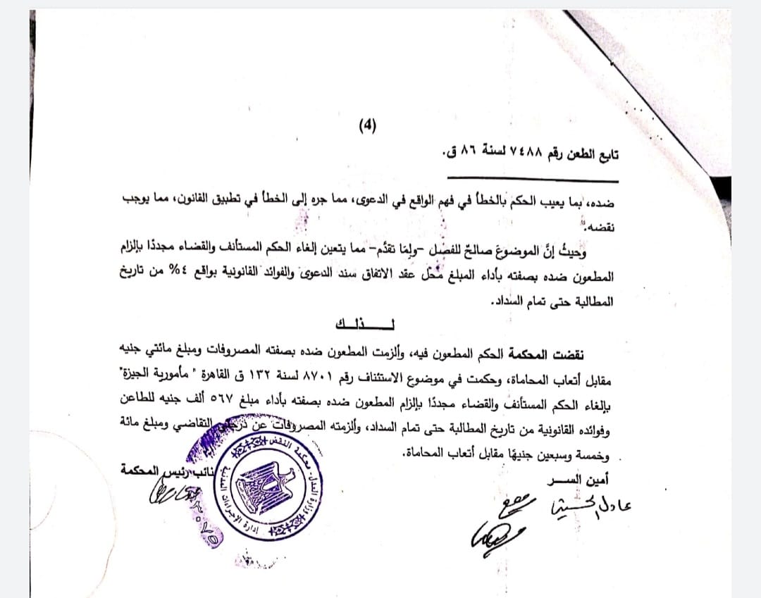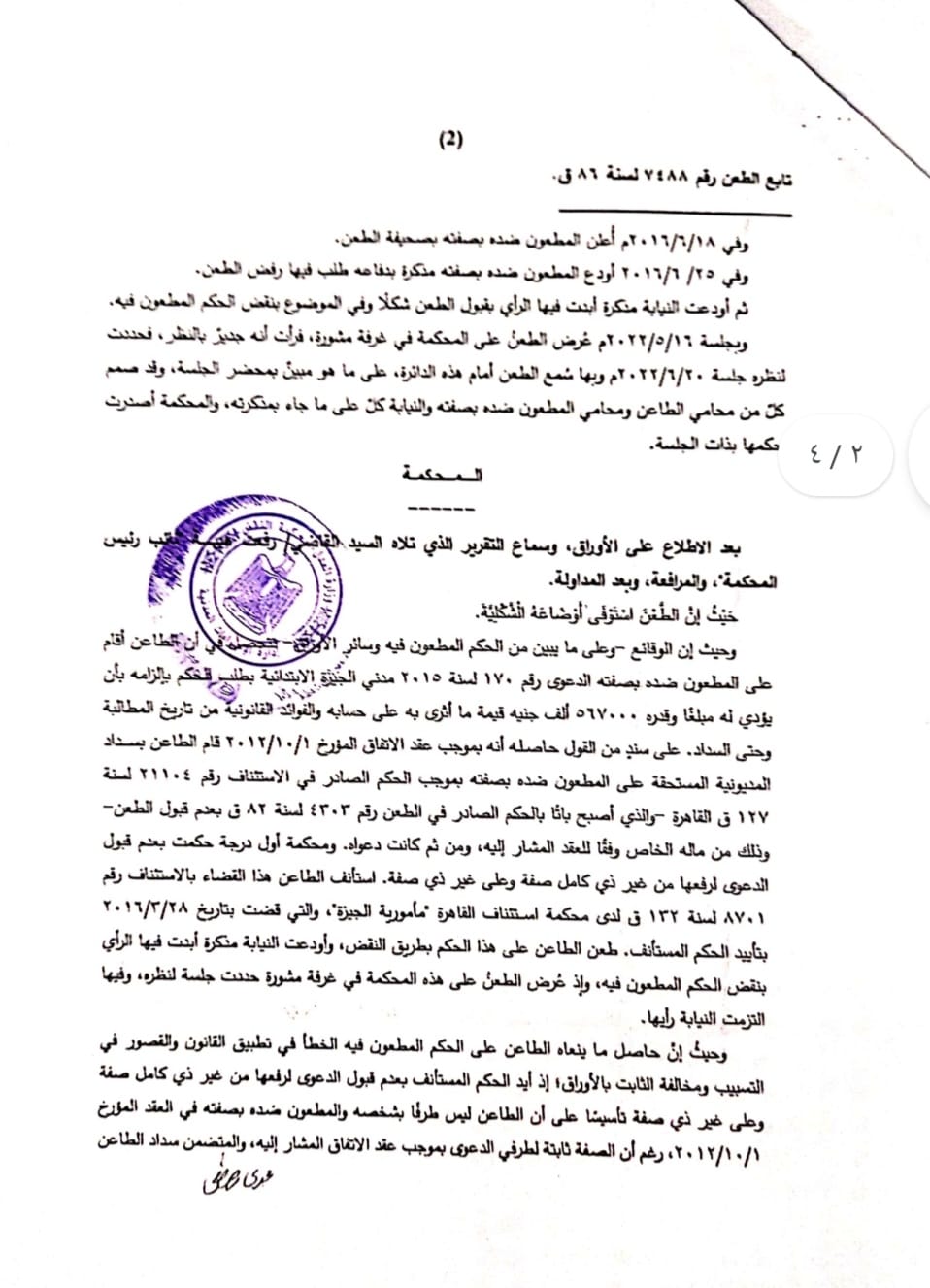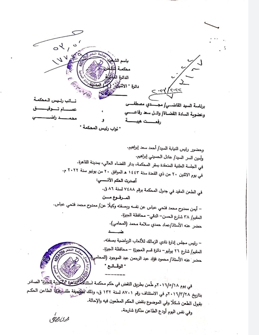 حكم محكمة النقض المصرية جاء فى الطعن رقم 7488 لسنة 86 قضائية ، وتضمن منطوق الحكم إلزام نادى الزمالك بسداد 567 ألف جنيه لصالح أيمن ممدوح عباس إضافة إلى فوائد قانونية بنسبة 4%.
