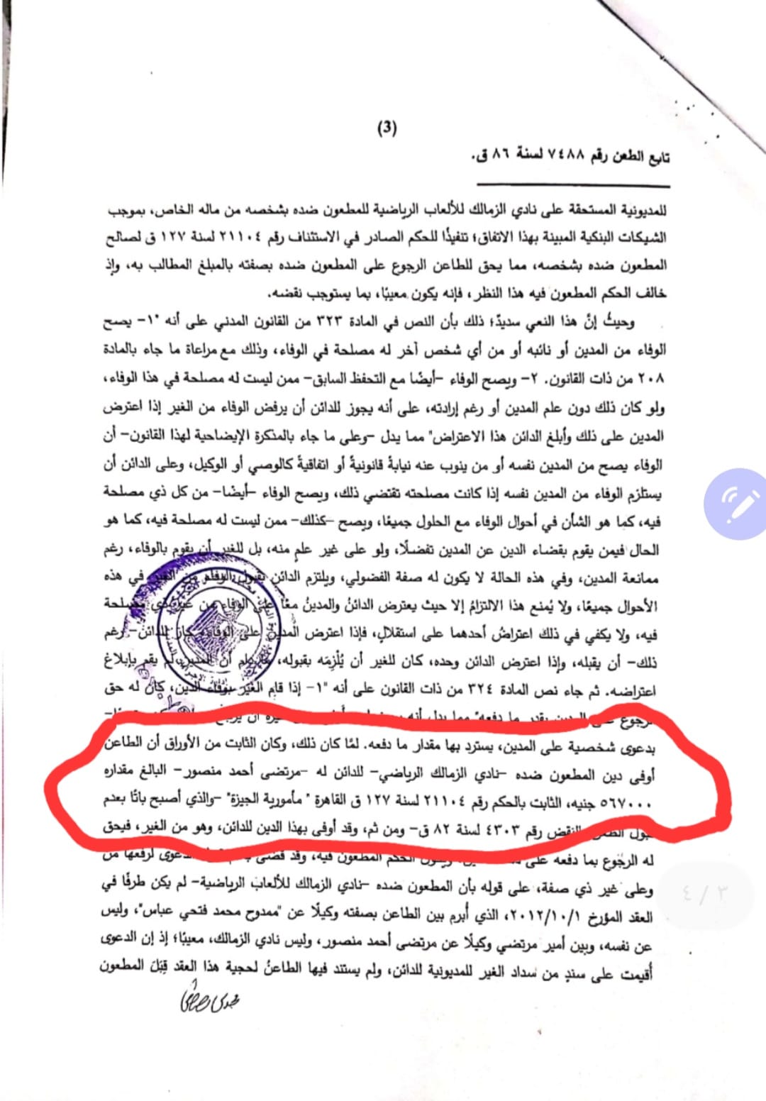 قضت محكمة النقض المصرية بحكم قضائى بات بإلزام نادى الزمالك بسداد مبلغ وقدره 567 ألف جنيه لصالح أيمن ممدوح عباس.