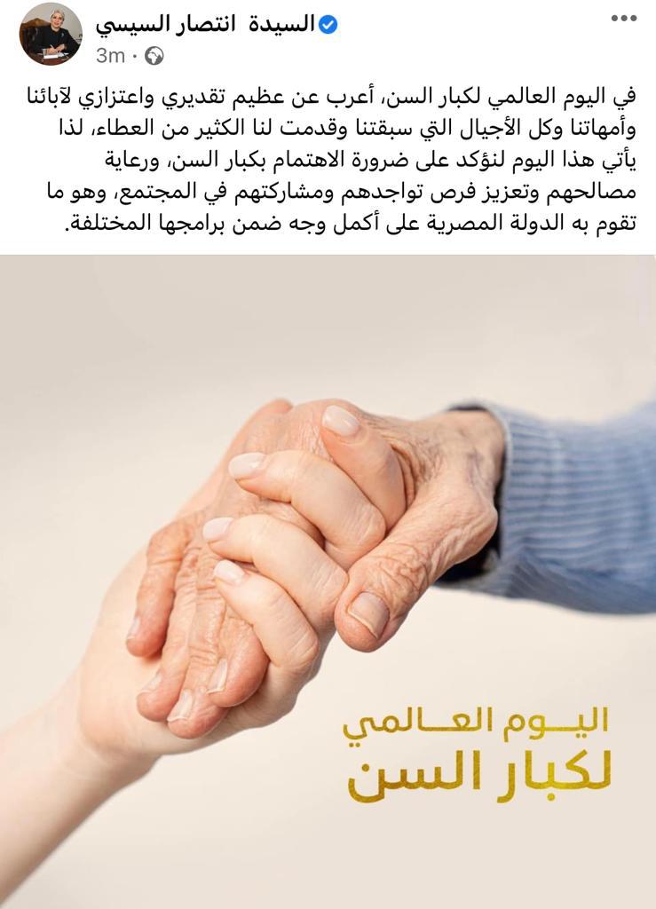 وأضافت السيدة انتصار السيسى، عبر حسابها الرسمى على موقع التواصل الاجتماعى "فيس بوك":" يأتي هذا اليوم لنؤكد على ضرورة الاهتمام بكبار السن، ورعاية مصالحهم وتعزيز فرص تواجدهم ومشاركتهم في المجتمع، وهو ما تقوم به الدولة المصرية على أكمل وجه ضمن برامجها المختلفة".