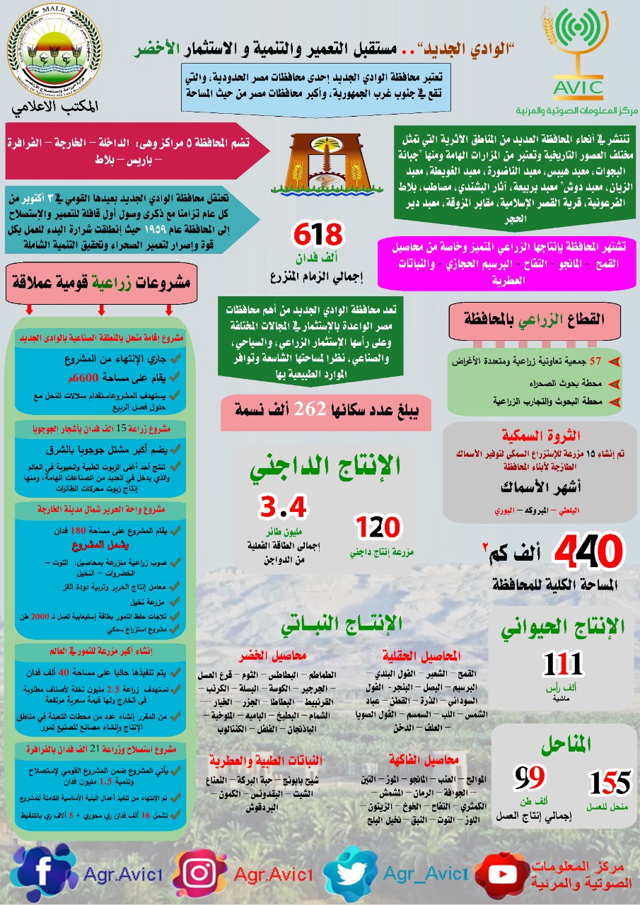 نشر مركز المعلومات الصوتية والمرئية بوزارة الزراعة واستصلاح الأراضي، انفوجراف بمناسبة العيد القومي لمحافظة الوادي الجديد، تحت عنوان: "الوادي الجديد" مستقبل التعمير والتنمية و الإستثمار الأخضر، حيث تحتفل المحافظة بعيدها القومي، في 3 أكتوبر من كل عام تزامناً مع ذكرى وصول أول قافلة للتعمير والإستصلاح إلى المحافظة عام 1959 حث إنطلقت شرارة البدء للعمل بكل قوة وإصرار لتعمير الصحراء وتحقيق التنمية الشاملة.