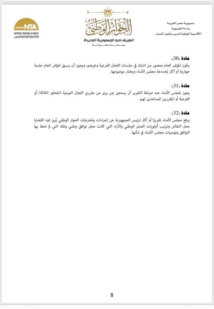 وعلى اللائحة المنظمة لعمل مجلس أمناء الحوار الوطني واللجان والفاعليات المتفرعة عنه الصادرة بقرار مجلس الأمناء رقم ٢ لسنة 2022،
